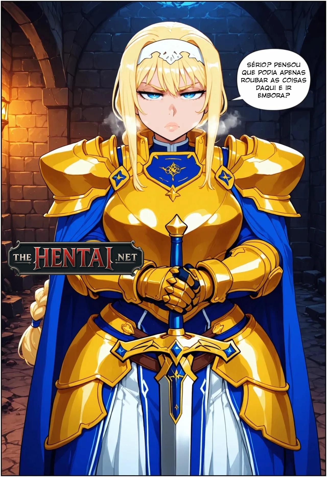 Exclusividade The Hentai: Um hentai simples sobre um negão fodendo uma loirona gostosa numa masmorra de RPG. Aqui ela está impedindo-o de seguir, dizendo que ele não pode apenas roubar a gema mágica, que é a recompensa dessa masmorra. Como ele não responde nada, ela se enche e usa o efeito da gema para tentar arrancar a resposta dele. O problema é que ela nem conhece o efeito desse item mágico e acaba se tornando uma puta de marca maior.
