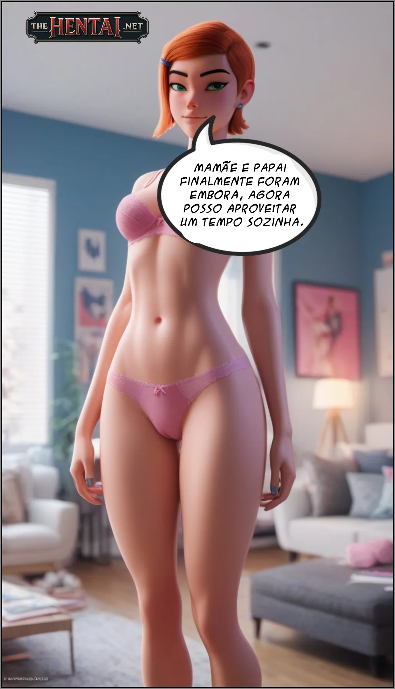 Exclusividade The Hentai: A Gwen está em casa sozinha com roupa íntima, e seus pais saíram para algum lugar, fazer compra ou algo assim, e dois assaltantes já estudam a movimentação da casa para assaltar. Depara-se com uma ruiva gostosa semi-nua que está disposta a transar com esses caras. E assim foi, e eles gozaram tanto na Gwen que decidiram que não iriam mais roubar a casa, pois são gente fina.